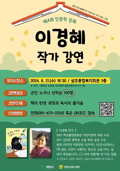 경기호연뉴스 민선기 기자 | 영암군이 이달 21일 삼호종합복지회관에 이경혜 작가를 초청, ‘2024년 제4회 인문학 강좌’를 개최한다.