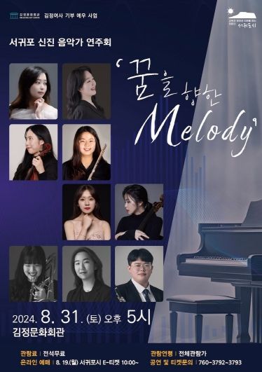 서귀포 신진 음악가 연주회 '꿈을 향한 멜로디'는 서귀포에서 중‧고등학교를 졸업한 후 도내외에서 음악가로 활동하고 있는 20대 음악가들이 성악, 바이올린, 플루트, 첼로, 클라리넷, 트롬본 등의 악기로 다양한 장르의 음악을 선보이게 된다.