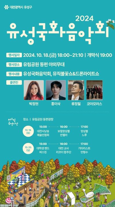 이번 국화음악회는 유성의 대표 가을 축제인 ‘유성국화축제’의 화려한 시작을 알리는 개막 행사로, 국내 정상급 가수 박정현, 홍이삭, 테너 류정필 등이 출연해 가을 분위기에 어울리는 감미로운 무대를 선보일 예정이다.