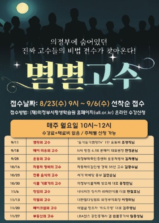 ‘별별고수 릴레이 특강'은 9월 11일부터 매주 월요일 오전 10시부터 12시까지 진행되며, 다양한 분야의 고수들이 자신의 경험과 지식을 나누어줄 예정이다. 총 10개 분야(캠핑, 미용, 운동, 자동차 정비 등)의 일상 속 맞춤형 특강으로 구성됐으며, 향후 ‘의정부시민대학 TV’유튜브 채널을 통해 온라인으로도 콘텐츠 서비스를 제공할 예정이다.