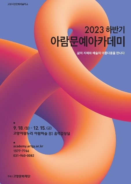 경기호연뉴스 김대엽 기자 | 고양문화재단은 고양아람누리 문화예술교육 프로그램 '2023 하반기 아람문예아카데미'를 9월 18일 월요일부터 12월 15일 금요일까지 12주간 진행한다. 예술과 인문학을 아우르는 총 14개의 프로그램을 마련하고, 현대예술의 감상과 이해를 돕는 수요 연속 기획을 추가하여 더욱 다채롭고 풍성하게 구성했다.