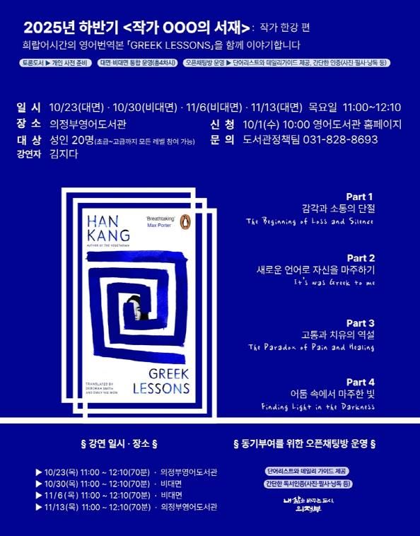 작가 OOO의 서재는 의정부 시민 20명(성인)을 대상으로 운영하며, 수강 신청은 10월 1일 오전 10시부터 의정부영어도서관 누리집에서 온라인 선착순으로 진행한다.