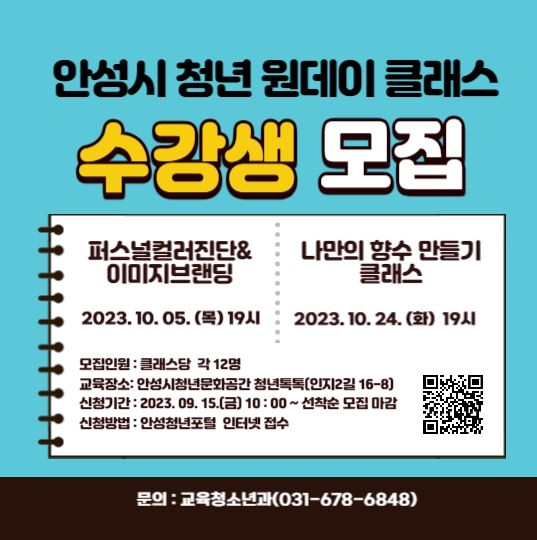 이번 10월 안성시청년문화공간 ‘청년톡톡’ 원데이 클래스는 청년들의 자기가치UP!을 테마로 퍼스널컬러진단&이미지브랜딩, 나만의 향수 만들기 클래스 2개 강좌로 운영된다.