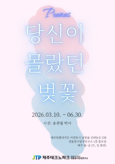 제주테크노파크(원장 지영흔, 제주TP) 청정바이오사업본부 생물종다양성연구소는 오는 6월 30일까지 서귀포시 남원읍 생물종다양성연구소 1층 홍보관에서 제주 자생 벚나무의 생태적 가치를 조명하는 ‘당신이 몰랐던 벚꽃’ 사진전을 개최한다고 10일 밝혔다.