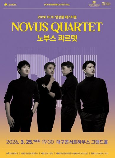 경기호연뉴스 민선기 기자 | 대구콘서트하우스(관장 박창근)가 선보이는 ‘2026 DCH 앙상블 페스티벌’의 대미를 장식할 하이라이트 무대가 찾아온다. 세계적인 현악사중주단 ‘노부스 콰르텟(Novus Quartet)’의 공연이 오는 3월 25일 오후 7시 30분 대구콘서트하우스 그랜드홀에서 열린다.
