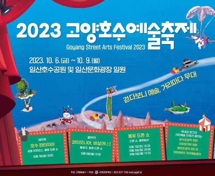 고양시를 대표하는 글로벌 거리예술축제 ‘2023 고양호수예술축제’가 오는 10월 6일부터 9일까지 4일 간 일산호수공원과 일산문화광장 일원에서 관객들을 맞이한다. 호수공원의 밤을 밝힐 불꽃 드론 쇼와 눈을 사로잡는 공연과 즐거움이 넘치는 체험프로그램까지 올 가을 고양호수예술축제로 도심 속 여행을 떠나 보자.