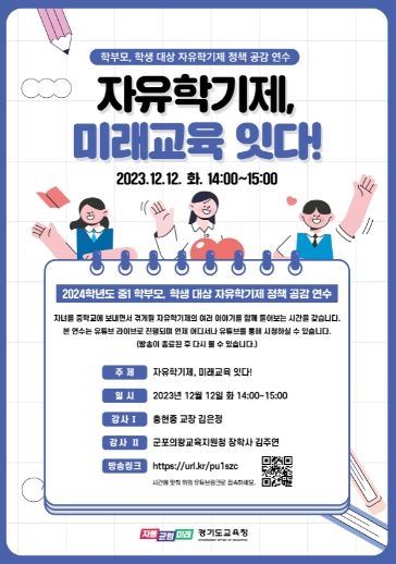 한편 도교육청은 2024학년도 자유학기제 홍보전단지를 제작해 배포하고, 자유학기제 운영 안내 전반이 포함된 ‘2024학년도 함께 만들어가는 중학교 교육과정’ 자료를 개발해 보급할 예정이다. 또한 교육지원청별 자유학기 운영 우수사례를 경기교육모아 사이트에 탑재하는 등 자유학기제 전면 시행에 따른 홍보 노력을 다양하게 기울일 계획이다.