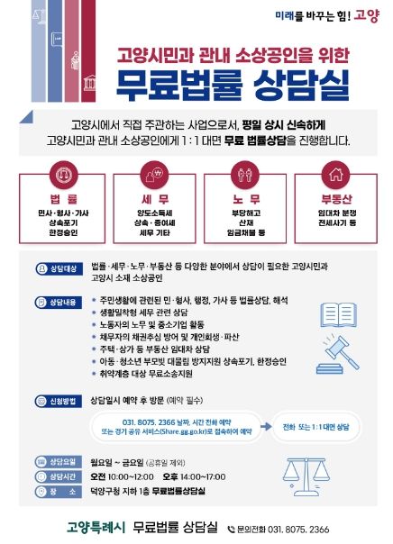 이동환 고양특례시장은 “무료법률 상담실이 시민들의 불편을 해소하고, 권익을 보호하는 데 도움이 되길 바란다”며 “시민들에게 실질적인 도움을 줄 수 있는 생활밀착형 행정서비스를 지속적으로 강화해 나가겠다”고 말했다.