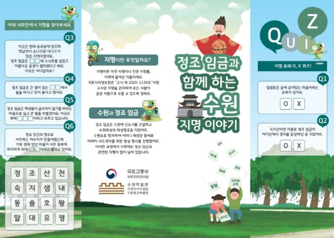 수원시 박물관사업소와 국토지리정보원이 협업해 정조대왕과 관련된 수원지역 지명의 숨은 이야기, 유래를 소개하는 홍보물 ‘정조 임금과 함께하는 수원 지명 이야기’를 제작했다.