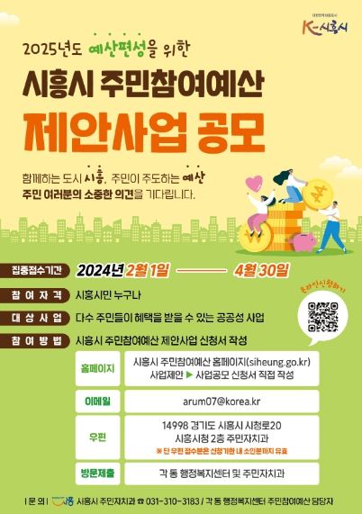 4월 말까지 접수된 제안사업은 일반제안사업과 자치계획형사업으로 구분한 뒤, 각각 주민참여예산위원회와 동별 주민자치회에서 심사 및 현장 확인, 주민투표 등의 과정을 거쳐 최종 선정한다. 선정된 주민참여예산사업은 2025년도 시흥시 예산안으로 편성할 계획이다.