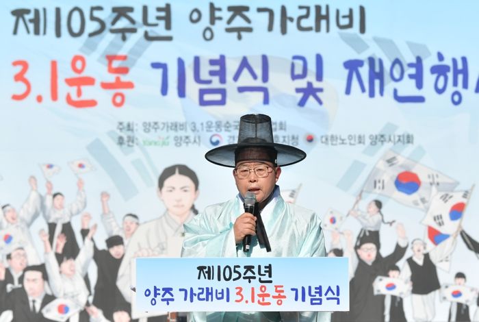 기념식은 대한노인회 양주시지회의 독립선언문 낭독, 주관 단체인 가래비3.1운동순국기념사업회 이채용 회장의 추념사, 기념사, 3.1절 노래제장, 만세 삼창 순으로 진행했다.