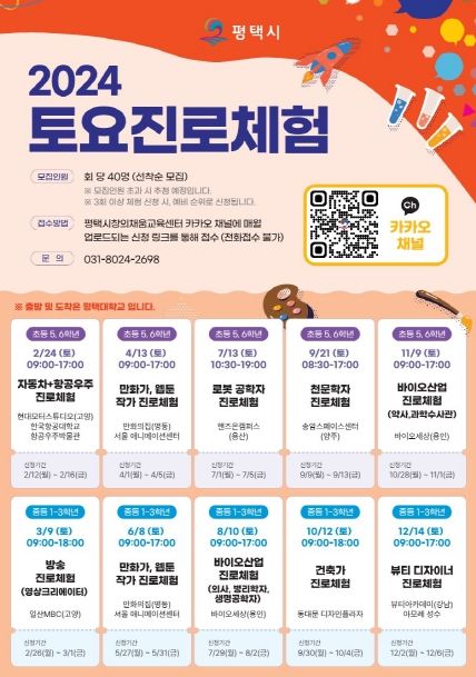 2024년 토요진로체험은 앞으로 총 8회의 체험 일정이 남아있으며 자세한 사항은 평택시창의채움교육센터 카카오톡 플러스친구 및 네이버 밴드 가입 후 확인할 수 있다.