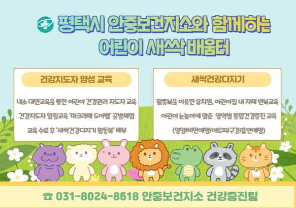 경기호연뉴스 김대엽 기자 | 평택시 안중보건지소는 미취학 어린이의 조기 건강 생활 습관 정착을 위해 평택 서부지역의 유치원과 어린이집 대상으로 새싹배움터 프로그램을 운영할 예정이다.