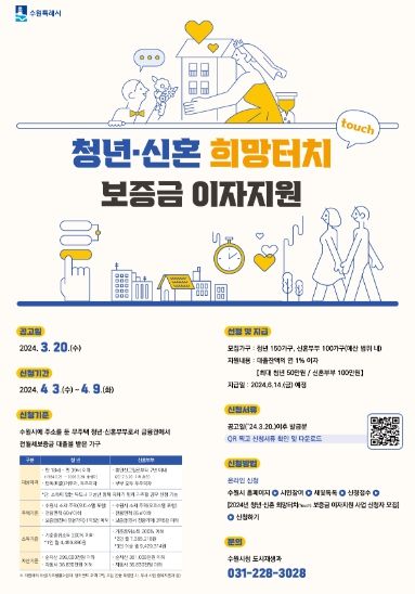 수원시 관계자는 “청년·신혼 희망터치 보증금 이자지원사업이 주거비 부담을 겪는 청년·신혼 가구에 도움이 되길 바란다”며 “앞으로도 청년층이 체감할 수 있는 주거복지 정책을 펼쳐 나가겠다”고 말했다.