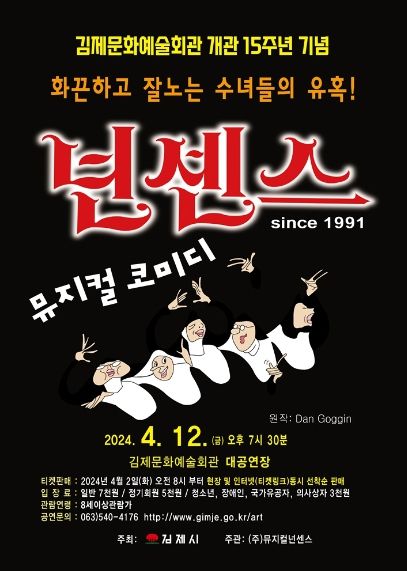 경기호연뉴스 김대엽 기자 | 김제문화예술회관이 개관 15주년을 맞아 오는 12일 오후 7시 30분 1991년 초연이후 1,000만 관객 동원 국내 공연사상 최장기록을 달성한 진정한 대한민국 국민 뮤지컬 '넌센스'를 김제문화예술회관 대공연장에서 관객들의 눈과 귀를 사로잡는다.