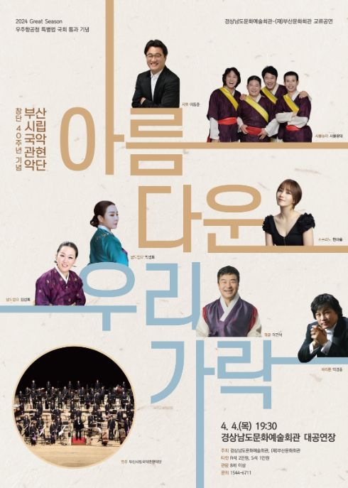 한편 올해 창단 40주년을 맞은 부산시립국악관현악단은 1984년 5월 23일 창단해 전통음악 계승 발전, 창작 음악 개발 등 폭넓은 활동을 펼치고 있다. 70여 명의 전문연주자로 구성돼 열정적이고 참신한 레퍼토리로 우리 음악의 예술적 향상과 대중화에 힘쓰고 있다.