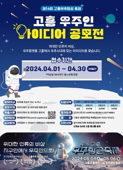경기호연뉴스 김대엽 기자 | 고흥군은 오는 5월 4일부터 6일까지 3일간 나로우주센터 우주과학관 일원에서 개최하는 제14회 고흥우주항공축제의 관심을 높이고, 우주항공 중심도시 고흥의 이미지를 정립하고자 ‘고흥 우주인 아이디어 공모전’을 개최한다.