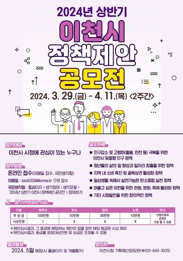 이천시 시정에 관심이 있는 시민이면 누구나 접수가 가능하며, 접수방법은 이메일 접수와 국민생각함 내 생각참여 - 생각모음‘2024년 상반기 이천시 정책제안 공모전’에서 참여가 가능하다.