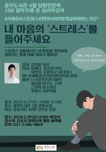 경기호연뉴스 김대엽 기자 | 김포시 풍무도서관이 달밤 인문학 프로그램 ‘내 마음속 스트레스를 들어주세요’를 오는 4월 17일 수요일 오후 7시에 풍무도서관 문화교실에서 운영한다고 밝혔다. 풍무도서관의 달밤 인문학은 격월로 진행하며 이번 주제는 철학 주제의 심리학을 대상으로 한다.