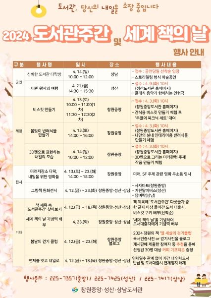 체험행사(나만의 반려식물 만들기, 3D펜으로 표현하는 내일의 모습, 비스킷 만들기)는 4월 3일 10시부터 창원중앙도서관 누리집에서 선착순 신청 가능하며, 인형극 ‘어린왕자의 여행’은 4월 9일 10시부터 성산도서관 누리집을 통해 신청할 수 있다. 또한 23일에는 세계 책의 날 기념떡을 배부할 예정이며, 그 밖에도 도서관 자료실 방문 시 참여 가능한 다양한 이벤트와 전시행사가 준비되어 있다.