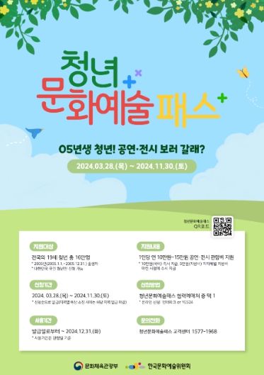 청년 문화예술패스는 문화예술인 창작활동 간접 지원과 문화예술시장 확대 등을 위해 19세 청년들에게 문화예술 관람료를 지원하는 것으로 지원금은 온라인 협력예매처(인터파크, yes24)에서 공연 및 전시 티켓을 예매할 때 사용할 수 있다.