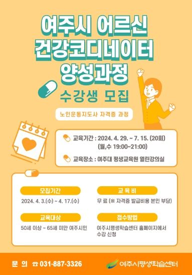 여주시 어르신 건강코디네이터 양성과정은 고령층이 많은 여주시의 지역특성을 고려하여 어르신들의 건강증진을 위해 선도적으로 추진하는 프로그램중에 하나로, 향후 어르신 건강과 관련된 정책에 활용할 수 있는 전문적인 지식과 스킬을 갖춘 인재를 양성하기 위해 계획됐으며, 노인운동지도사 자격증을 취득할 수 있다.