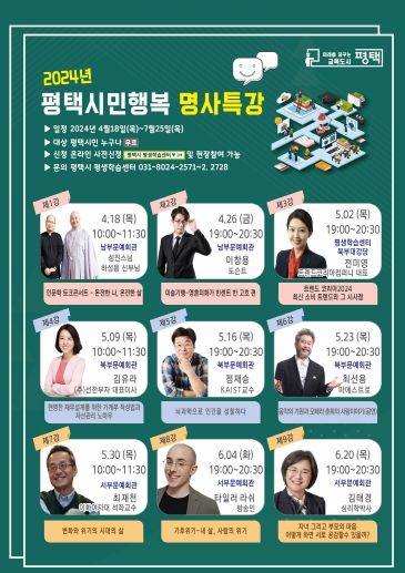 경기호연뉴스 민선기 기자 | 평택시는 평생학습 활성화를 통한 시민의 행복 증진을 위해 노력하는 평택시의 평생학습사업의 하나로 대한민국 최고의 강사진으로 구성된 ‘2024년 평택시민행복 명사특강’ 강연을 오는 18일부터 운영한다.