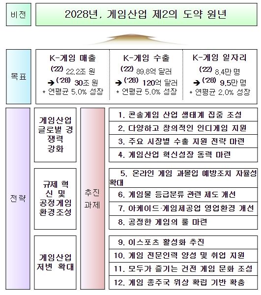 이에 정부는 게임산업에 새로운 성장동력을 마련해 케이-게임이 재도약할 수 있도록 ‘게임산업 진흥 종합계획’을 수립했다. ‘2028년, 게임산업 제2의 도약 원년’을 비전으로, 3대 추진전략과 12개 추진과제를 마련했다.