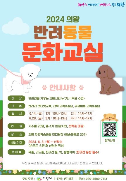 경기호연뉴스 민선기 기자 | 의왕시는 오는 6월 14일과 28일 왕송호수 잔디광장(왕송못동로 307)에서 오전(10시~1시), 오후(2시~5시) 3시간씩 총 4차례 반려동물 문화교실을 진행한다고 밝혔다.