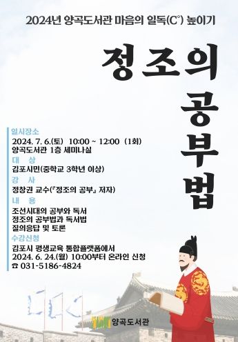 경기호연뉴스 민선기 기자 | 김포시 양곡도서관은 양곡도서관 마음의 일독(C°) 높이기 ‘정조의 공부법’을 오는 2024년 7월 6일 10시에서 12시까지 양곡도서관 1층 세미나실에서 운영한다.