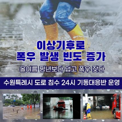 수원시 관계자는 “기후 변화로 인한 예측 불가능한 폭우로 인명·재산 피해가 늘어나고 있다”며 “기상특보가 발효되면 도로침수 24시 기동대응반을 가동하고, 경찰·소방서와 긴밀하게 협력해 안전사고가 발생하지 않도록 신속하게 대응하겠다”고 밝혔다.