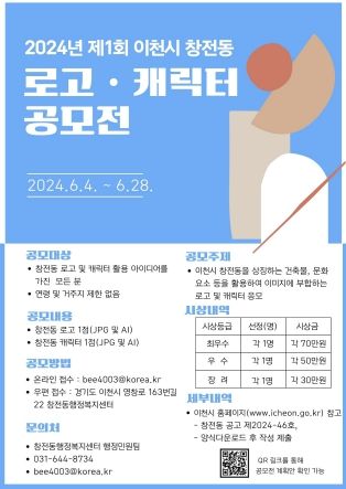경기호연뉴스 민선기 기자 | 이천시 창전동행정복지센터는 창전동을 대표하는 로고 및 캐릭터 공모전을 개최했다. 공모전은 총 2가지 부분으로 공모하며 로고와 캐릭터를 창전동을 상징하는 건축물, 문화 요소 등을 활용하여 이미지에 부합하게 응모하면 된다.