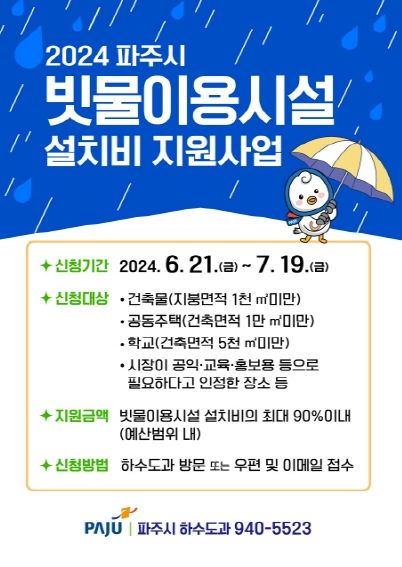 경기호연뉴스 민선기 기자 | 파주시는 기후변화에 따른 물 부족 문제에 적극 대응하고, 수자원의 효율적 활용을 위해 ‘2024년 빗물이용시설 설치비 지원사업’ 대상자를 6월 21일부터 7월 19일까지 모집한다.