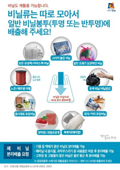 이에 안성시는 종량제봉투에 버려지는 폐비닐을 최대한 분리배출해 재활용에 나선다. 폐비닐 분리배출 품목도 확대되서 과자·커피 포장비닐, 일반 비닐봉투와 완충재 등 모든 비닐, 보온‧보냉팩, 과일포장재, 플라스틱 노끈도 분리배출 품목에 포함된다. 폐비닐이 작아도, 이물질이 묻어도 재활용 가능하므로 내용물을 비워서, 음식물로 심하게 오염된 폐비닐은 물로 헹구는 등 이물질 제거 후 분리배출해야 한다.