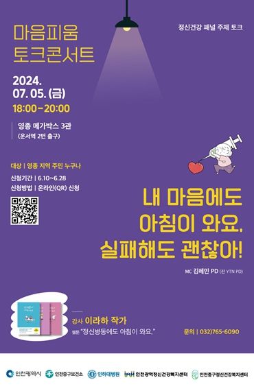 조상열 시 건강증진과장은 “이번 행사를 통해 시민들이 정신 건강에 대한 중요성을 인식하고 또 하나의 힐링이 되길 바란다”면서, “앞으로도 인천시민들의 정신 건강을 위해 다양한 방면으로 힘쓰겠다”고 말했다.