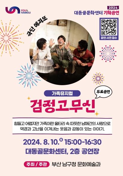 다음 공연은 8월 10일 15시, 극단 에저또의 가족뮤지컬'검정고무신'이 준비되어 있다. 관람 신청은 현장방문 또는 공연포스터 QR코드를 통해 가능하다.