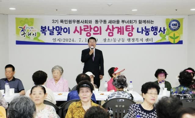 이날 행사를 위해 제3기 목민원우봉사회 회원들이 이틀에 걸쳐 정성을 다하여 음식 준비를 했으며, 동구동 새마을부녀회, 새마을지도자협의회와 동구동 기간단체장들이 함께 자원봉사에 참여해 지역 어르신들에게 삼계탕과 떡, 과일 등을 대접했다.