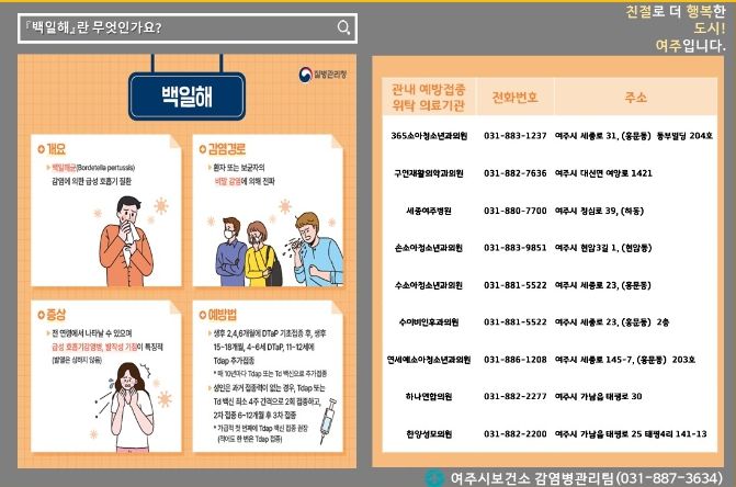 경기호연뉴스 민선기 기자 | 여주시보건소 보건행정과는 최근 전국적으로 백일해 환자가 급증함에 따라 백일해 예방 접종 및 개인위생 준수를 당부했다.