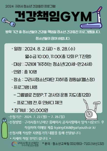 경기호연뉴스 민선기 기자 | 구리시청소년재단 청소년수련관은 관내 후기(20~24세) 청소년들의 건강한 성장 및 발달을 위해 구리시 청소년 건강증진 프로그램인 ‘건강책임GYM’을 운영한다.
