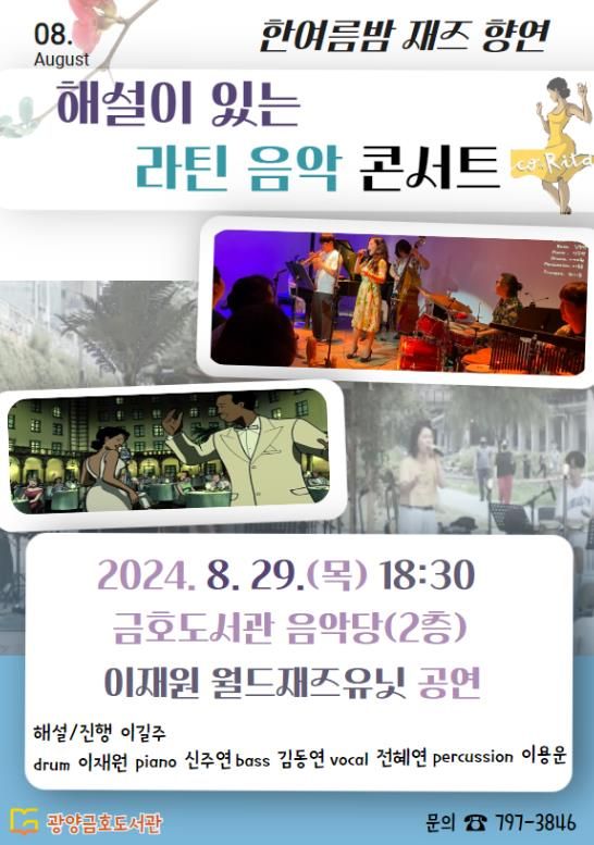 경기호연뉴스 민선기 기자 | 광양금호도서관이 오는 8월 29일 목요일 18시 30분, 금호도서관 음악당에서 광양시민 80명을 대상으로 예술 특화 행사 ‘해설이 있는 한여름 밤 재즈 향연 – 해설이 있는 라틴 음악 콘서트’를 개최한다.