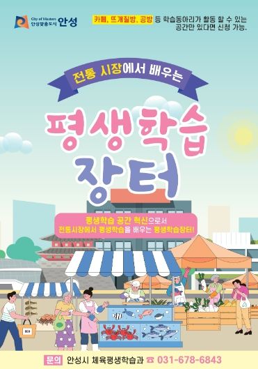평생학습장터는 평생학습 공간 혁신으로서 안성시 전통시장 상인 생활․유휴 공간을 평생학습 공간으로 지정하여 전통시장 내 장도 보고 평생학습도 참여하는 전통시장 상권의 활성화를 위해 안성시에서 시행하는 사업이다.