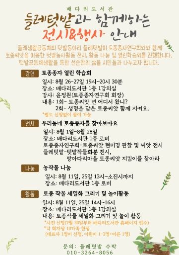 경기호연뉴스 민선기 기자 | 생태 특화도서관인 평택시 배다리도서관은 8월 한 달 동안 시민단체 ‘들레텃밭’과 ‘토종종자연구회’ 협력으로 토종 씨앗 관련 전시와 강연, 체험행사를 연다.