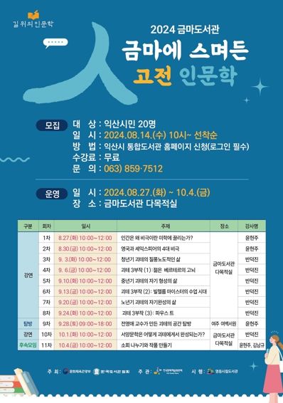 경기호연뉴스 민선기 기자 | 익산시 금마도서관이 '2024년 길 위의 인문학'사업으로 오는 27일부터 '금마에 스며든 고전 인문학' 프로그램을 운영한다.