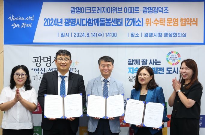 협약에 따라 한국커뮤니티연구원은 올해 9월부터 광명아크포레자이위브 다함께돌봄센터를, 한국복지연대사회적협동조합은 11월부터 광명광덕초 다함께돌봄센터를 5년간 위탁 운영한다.