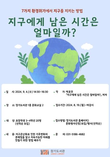 경기호연뉴스 민선기 기자 | 김포시 장기도서관은 9월 4일 오후 2시 30분에 초등학생 3~4학년을 대상으로 '지구에게 남은 시간은 얼마일까?'를 운영한다.