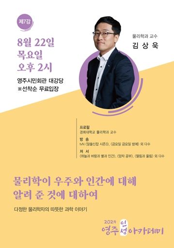 경기호연뉴스 민선기 기자 | 영주시는 오는 22일 오후 2시 영주시민회관에서 경희대학교 물리학과 김상욱 교수를 초청해 ‘물리학이 우주와 인간에 대해 알려 준 것에 대하여’라는 주제로 8월 영주인성아카데미를 개최한다.