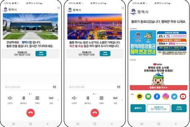 시에 따르면 평택시가 시민에게 전화를 걸 때 시민의 스마트폰 화면에 평택시청 이미지와 함께 부서명과 행정 전화번호가 표시되고, 통화 종료 시에는 최신 시정 안내 및 행사 정보 등을 제공할 것이라고 밝혔다.
