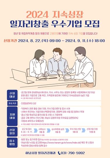 경기호연뉴스 민선기 기자 | 하남시는 지역경제 발전과 고용 촉진에 노력하는 지속성장 일자리창출 우수기업에 직원복지와 관련된 필요경비 등 다양한 혜택을 부여하기 위해 오는 9월 11일까지 ‘2024년 지속성장 일자리창출 우수기업’을 모집한다고 밝혔다.