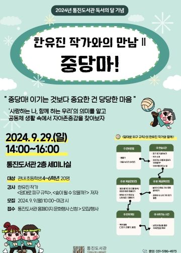 경기호연뉴스 민선기 기자 | 김포시 통진도서관은 2024년 독서의 달 기념 ‘한유진 작가와의 만남Ⅱ-중당마!(이기는 것보다 중요한 건 당당한 마음)’를 오는 9월 29일 일요일 14시에서 16시까지 통진도서관 2층 세미나실에서 운영한다.