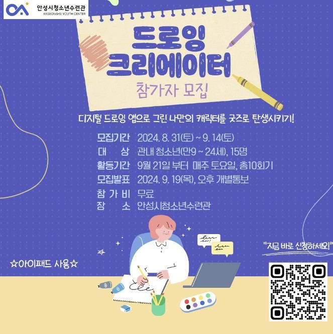 경기호연뉴스 민선기 기자 | 안성시청소년수련관은 제7차 청소년정책 기본계획을 반영, 청소년의 디지털 역량 강화 활동을 제공하고자 관내 청소년을 대상으로 ‘드로잉 크리에이터’ 프로그램을 운영한다.